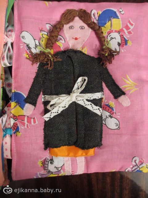 Страница 1 Девочка в виде апликации из цветных кусочков ткани, вышитые части лица, нос объёмный, заполнен синтепоном, на ушах пришиты бусинки-серёжки. Волосы сделаны из жёлтой тесьмы, пришиты на отлёт так, что можно плести косички, можно учиться вплетать ленту. На ладошке пришита пуговица в виде блестящей сумочки или кошелька, рядом приклеена термапликация – котёнок.