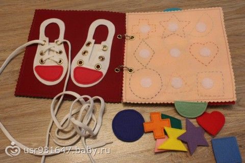 Сшила вторую книжку своему малышику. Он сейчас любит всякие шнурочки, поэтому вся книжка на эту тему, к тому же это очень полезно для развития мелкой моторики.