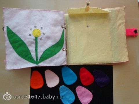 В каждом лепестке цветика — разное содержимое, и крепится каждый по-своему — на завязку, на кнопку, божья коровка- пуговка. На соседней страничке божья коровка, а расстегнув молнию, можно увидеть её деток, которые на ленте и никуда не пропадут))