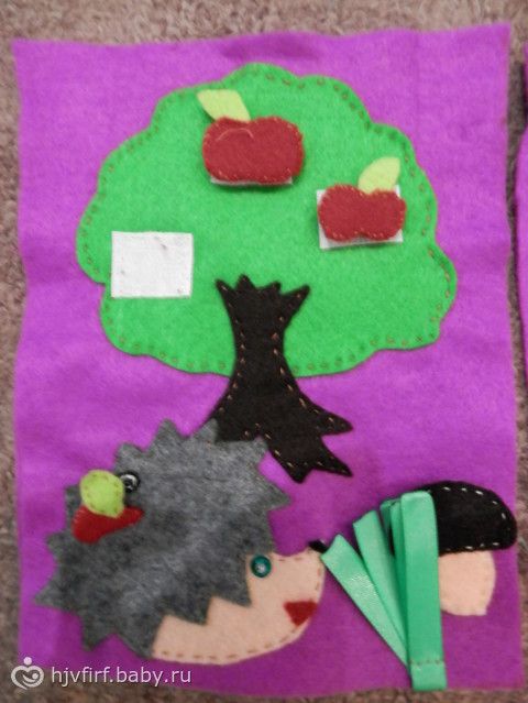 Разворот лесная полянка.5 цветочков на пуговках, в центре одного цветка липучка, на которую можно прицепить пчёлку, пальчиковую игрушку.на дерево вешаются яблочки. Цветочки можно сложить в кармашек снизу. На кармашке сидит гусеница, которую нужно собрать по цветам радуги. Ёжик с липучками, на которые он собирает грибочки и листики.