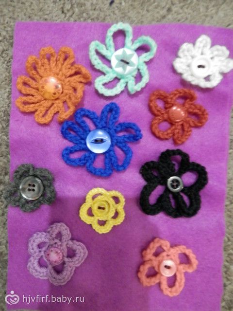 фото 6. Цветочки на пуговичках. Сняв цветочки с пуговичек ребенку необходимо восстановить серединку (пуговичку) с самим цветочком того же цвета. Все пуговички разного размера и фактуры, цветочки так же из разных ниток, с разным количеством липесточков.