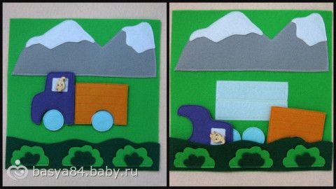 Сейчас шью книжечку очередную, будет достаточно «тискательная».т.к. хозяину годика еще не исполнилось. Хочу поделиться с вами страничками, которые еще до этого не шила.Страничка с игрой «ку-ку» — львенок прячется за лапками. Страничка с осьминожком — перебираем и считаем бусины. страничка с дергалками— много различных элементов для «троганья»:) Ракета летит в небе — учим понятия один-много, и большой-маленький. Страничка с уликами— учим насекомых (улитку, божью коровку, пчелку, бабочку) и играем в «окошки» — отогни и посмотри ко спрятался.Божья коровка двигается по нити. И страничка с грузовиком — грузовик — пазл из 4 деталей на липучке, внизу куст-карман, куда складываем детали, в кабине сидит шофер — утенок.