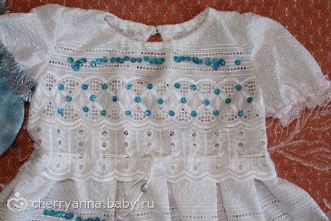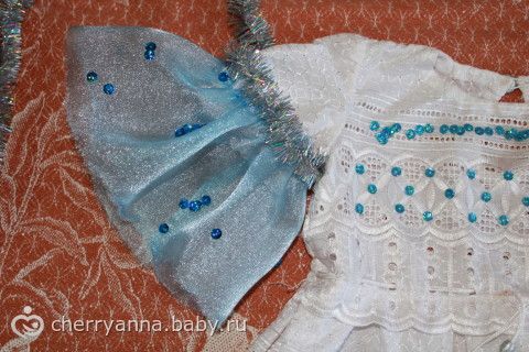 я бы рукава не пришивала, только серебристой мишурой… и вместо голубой органзы беленькую взяла бы… а пайетки и голубые и синие можно… на белом очень красиво смотреться будут