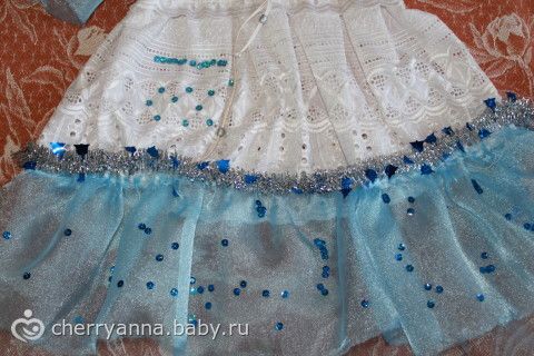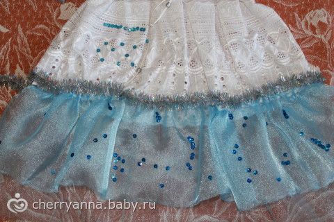 вот думаю с низом юбки также сделать или просто обметать, и если на низ юбки паетки, то какие голубые или синие? Или так и оставить низ юбки. и еще там на юбке сверху органза по ней пущу паетки в разброс, а снизу фатин. что с фатином делать оставить ровным или сделать острые концы, как будто лучики от снежинки.