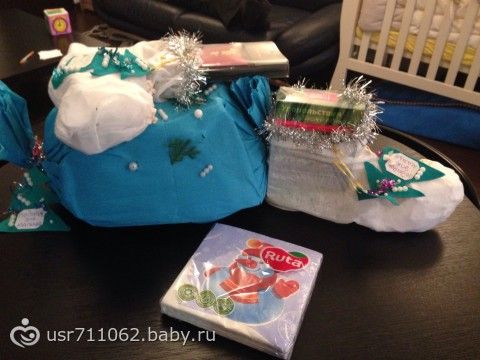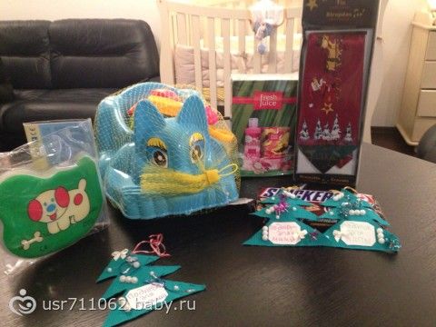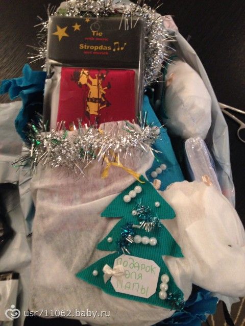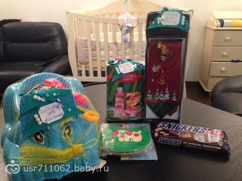 Мне и мужу досталось по сапожку с подарками, а сынуле конфета. Каждый подарочек был подписан с красивыми елочками самодельными .