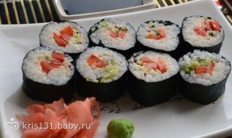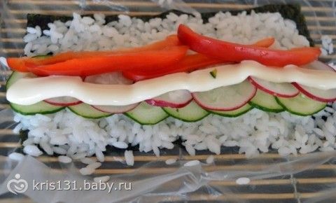 На пленку выкладываем лист нори шершавой стороной вверх и распределяем четверть получившегося риса. Если начинки кладете много, то с обеих сторон оставьте непокрытый рисом край, который слегка смочите водой. Поверх риса уложите овощи, резанные полосками, соломкой или тонюсенькими, прозрачными кружочками, сверху майонез. Приподнимая край макисы, аккуратно сверните ролл по направлению от себя, слегка придавливая его руками. Овощные роллы я люблю крутить рисом внутрь так, чтобы нори была сверху. Давить сильно не нужно, иначе начинка вылезет с обоих концов. У вас должна получится упругая черная колбаска. Подравняйте пальцами с обоих концов. Повторите то же самое с оставшимися ингредиентами. Получившиеся колбаски разрежьте острым, смоченным водой ножом на 6-8 кусочков.