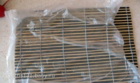 Макису (бамбуковый коврик для скручивания роллов) оборачиваем пищевой пленкой или, как в моем случае, полиэтиленовым пакетиком.