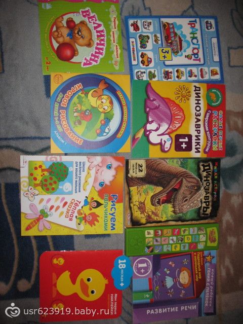 это развивалки-рисовалки. понравилась простенькая книга величина- с картонными вкладками.правда половину сын и так знал.но все равно полезно и интересно.очень качественная книга с многоразовыми наклеками-мои первые наклейки, покупаем уже вторую из серии. продолжаем скупать серию про развитие речи. книга про динозавров с модулем больше для меня-с детства к ним не равнодушна… а тут еще и со звуками…