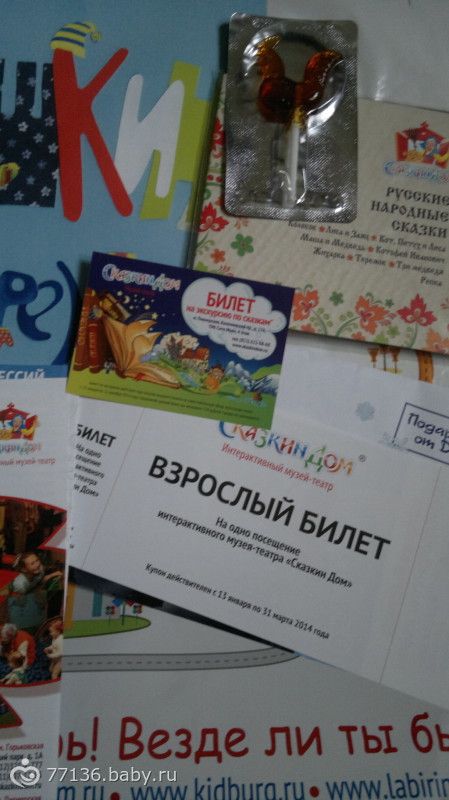 Подарок состоит в том числе из цветной книжки с 0, диска со сказками, пары билетов на вход для взрослых (с билетом скидка будет 150-200 руб.):