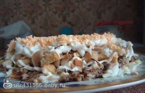 7. Салат делаем слоями: -2 яйца на крупной тёрке -шпроты -лук обжаренный -майонез -сухарики -майонез -грибы -2 белка на крупной тёрке -майонез -2 желтка на мелкой терке