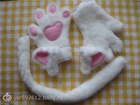 это для вдохновения, купила мех исскуственый, он дрянь такая, сыпется, в маске надо шить, просто рукавички сшила, а ушки не на ободке, а на резинке, черной, мех у меня пятнистый типа леопард, платье наверное это будет, типа котенок леопарда в платице, хотела вобще чтоб все беленькое былоцыпленком