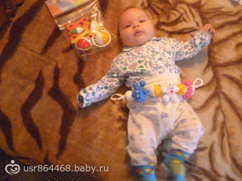 И еще кофточка, ползунки и носочки таких погремушек у нас не было, облюбовал себе в виде ромашки, она легче других даже попробовал ее на вкус.