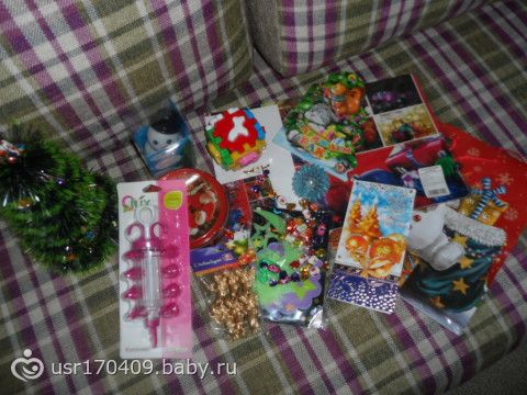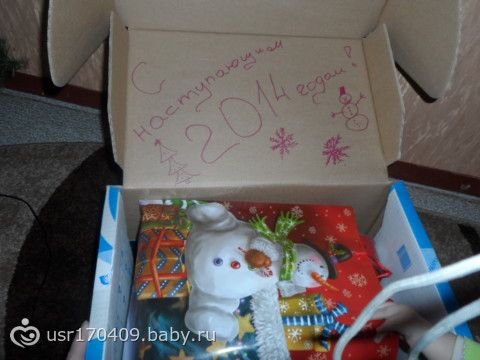 Тут как получилось сфотографироватьПодарочки были упакованы в красивый новогодний пакетик и разрисована коробочка ммм… Вот всё добро)))))) Не могу не сказать, что всё в тематике Нового года!!!
