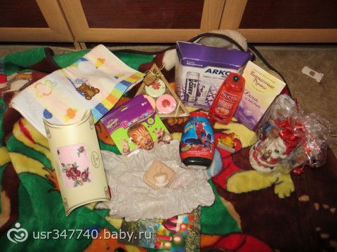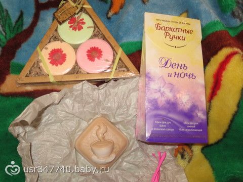 Обалденно пахнущая шипучая соль для ванны (как раз хотела себе такую купить), набор крема для рук (мои любимые бархатные ручки) и просто потрясающее МЫЛО РУЧНОЙ РАБОТЫ… (если честно… я его уже спрятала)))