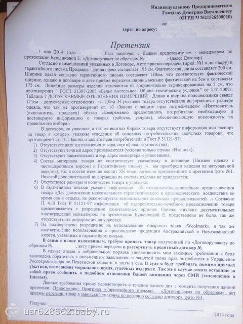 Претензию по которой удалось вернуть одеяла во вложени. Да, хотела еще сказать на руки выдают не договор купли- ппродажи, а заказ по образцам — Видимо КИТАЙ шьет по образцам из Италии, но из какой шерсти?...: