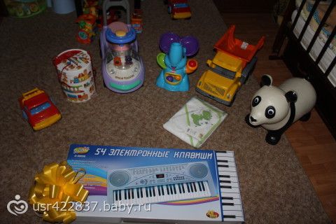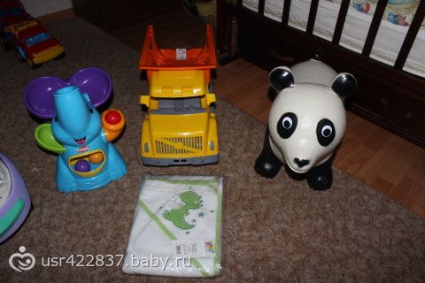 ну и вот наши подарочки(слон воздушный фонтан самосвал большой-набор для купания полотенчик рукавичка, панда прыгунок)