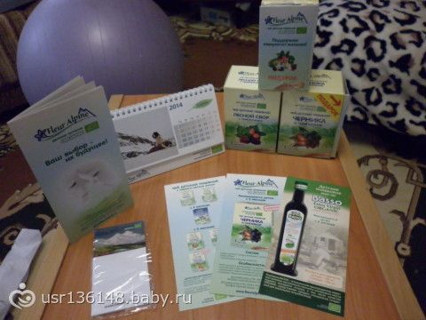 В посылке было 3 вида чая (на двух пачках подарки, еще по три пакетика пробного), настольный календарь с откидными листами, магнит со стикерами на холодильник, буклеты, ну и книженция с ассортиментом их продукции!