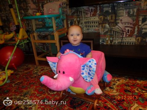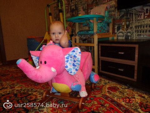 вот такого умилительного слона нам подарила крестная, на нем можно и качаться и по квартире кататься, еще и музыку в нем встроена, так что катаемся теперь на слоне.
