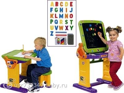 столик сейчас вам нужнее, за нем можно сидеть и первые каляки-маляки рисовать… а мольберт отдельно можно купить годам к 3… притом 2х сторонний, чтоб и фломастерами и мелом рисовать...