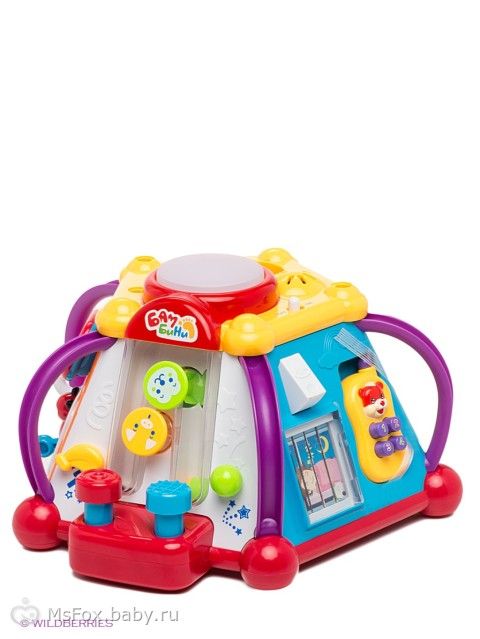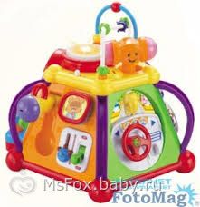 Там 5 сторон + верхушечка и все разное! Где-то крутится, где-то пищит, где-то музыка игроет и т.д. Есть даже микрофон )))) Короче ребенок был очень доволен. До сих пор им играет!