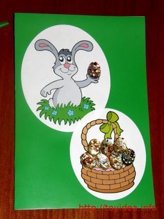 Используя те же тематические наклейки и бусины в форме миниатюрных пасхальных яиц, в подарок сестричке мы также приготовили еще и пасхальную открытку, внутри которой поместили распечатки пасхальных яиц для раскрашивания. Детки практически одного возраста, так что моя малышка активно принимала участие и в формировании набора и в подготовке открытки, – кому как не деткам лучше всего знать, чего бы им хотелось:-).