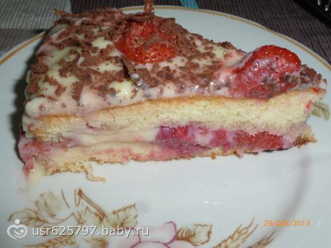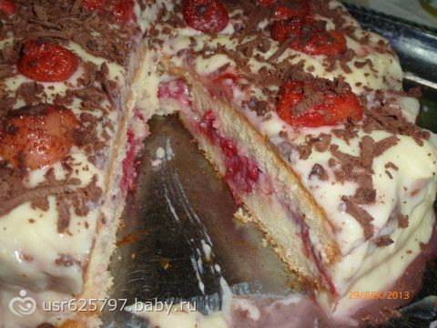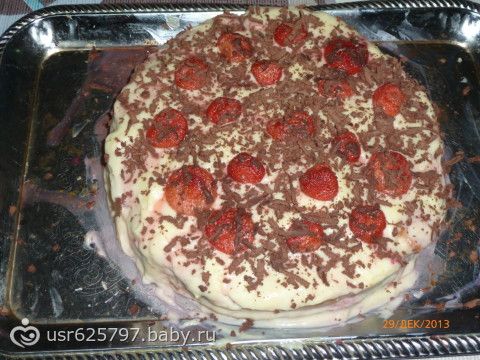 Я смазала бумагу маслом подолнечным, легко сняла её потом.))) Как бисквит остыл разрезала пополам и смазала пышки сиропом (5ст. ложек сахара и 7 си.л. воды (можно наливки) закипятила как остыло налила 1 ст.л. коньяка) потом мазала кремом заварным, положила малину и клубнику) вроде все. Если муж с дочей посидит то сделаешь быстро)))