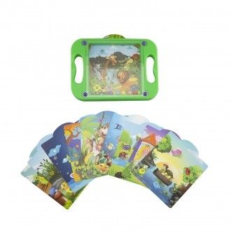 Карточек много, еще и двусторонние. Вставляешь карточку и в ямки загоняешь шарики по цветам! Попасть сложно, так как ямки не глубокие. Но игра захватывает. Не понравилось, что 3 цвета планшетов (я выбрала зеленый, есть еще желтый и фиолетовый) и у всееех карточки разные. Хочется все карточки))