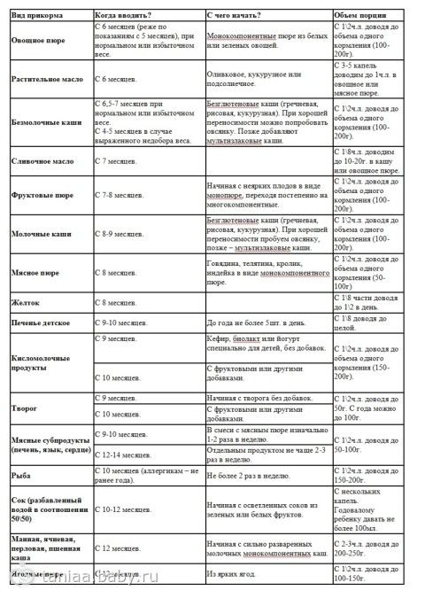 у каждого своя табличка)) врач советовал учитывая то, что мой младший был на св. да и старшему так же прикорм вводила, хотя был на гв))скажу вам больше: в год мои дети ели все с общего стола и даже сосиски