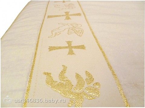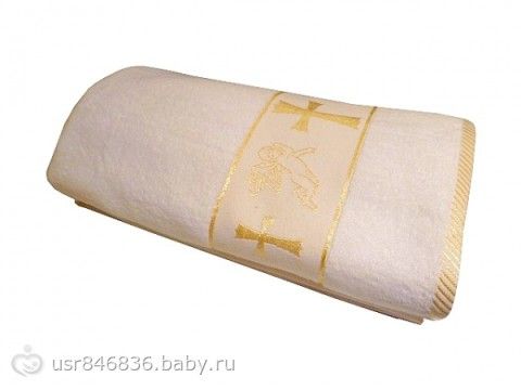 там же в Уютерре… Оно белое и на нем вышивка золотым — крестики и ангелочки! Размер 50х90. Очень крутое по качеству! Стоило 290 — на самом деле хотела подешевле (т.к. использовать буду только на крещение и вытирать иногда), но очень уж понравилось ))
