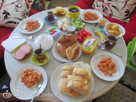 вот и у нас также, сыр, оливки, овощи, что-то пожарить и обязательно свежий хлеб и несколько стаканов чая. Но вот что пожарить у меня уже идеи кончились. вижу у тебя на столе колбаска, тоже хинди салам (пынар или что-то другое?)? а на счёт остренького я не разрешаю (я на счёт аджики с утреца), так как у него потом живот болит. я тоже люблю булочки с утра, типа poğaça или açma, семит обожает муж