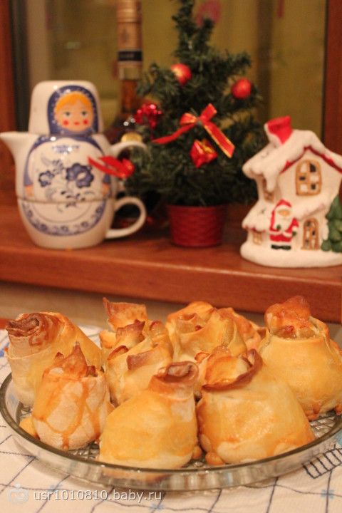 я узнала) если полоски теста сделать поменьше в ширину — будут видны яблоки)