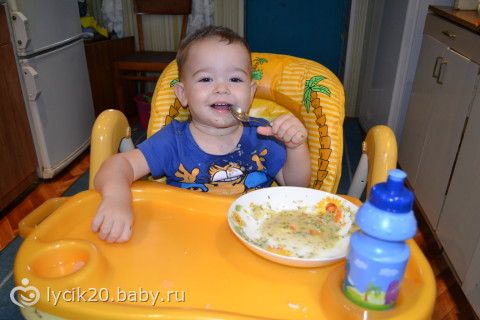 Кушать уже пытается сам, конечно с моей помощью, но жевать совсем не любит, поэтому стараюсь готовить все жидкое. Сам уже пьет из кружки, а перед сном еще кушаем мамину сисю.