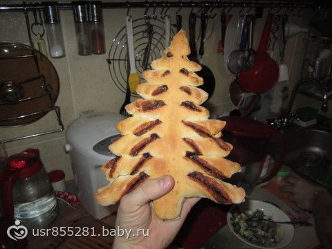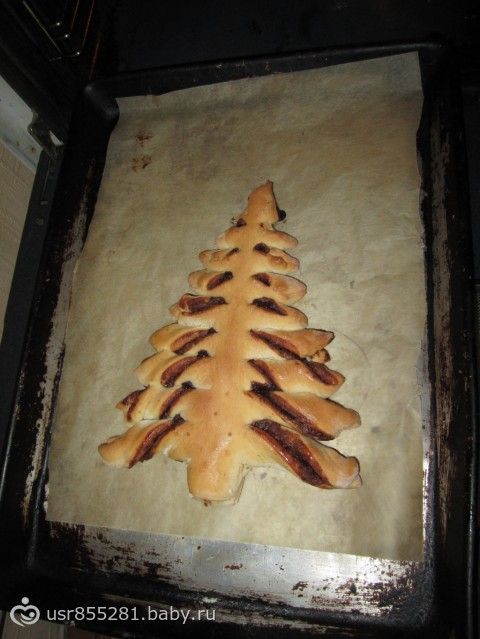 Купите в магазине готовое дрожжевое тесто и любую начинку. Например, шоколадную пасту. Раскатайте тесто в два пласта толщиной примерно в 0,5 сантиметра. Наложите один слой на другой и вырежьте треугольник с равными сторонами. Противень накройте бумагой для выпечки, переложите один пласт теста и смажьте шоколадной пастой. Накройте вторым пластом Слегка прикатайте и нарежьте полосками, не доходя до середины. Самые нижние полоски подрежьте, чтобы получилась ножка елки. Закрутите каждую полоску вверх, чтобы пирог получился пышным. Дайте пирогу расстояться 10-15 минут и отправьте в духовку. Выпекайте до золотистого цвета.