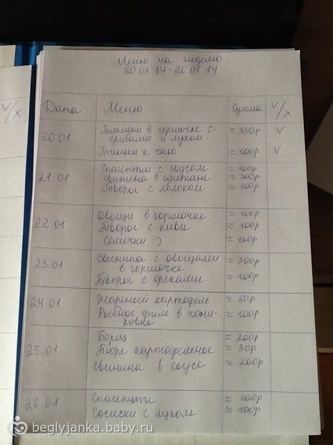 Очень большую часть бюджета у нас занимает… правильно! ЕДА. Вы уверены, что стоит столько тратить на продукты сколько вы тратите? Или может вы вообще не в курсе того, сколько тратиться на нее? Итак, (девочки летящие давно это вас особенно касается!) ваша задача на сегодня — написать ваше традиционноеменю на неделю. Примерное. Просто вспомните что вы готовили на этой неделе и прикиньте что будете готовить до понедельника. Я понимаю, что все может измениться — где-то кто-то поест в кафе, а к кому-то нагрянут гости. Но это не важно. Пока наша цель не точное меню (до него доберемся), а ориентировочное. Цель задания — посчитать сколько примерно и каких продуктов тратится на неделю в вашей семье. Соответственно, результатом будет возможность прикинуть сумму бюджета на продукты на неделю. В отчете хочу увидеть ваше меню, количество продуктов (примерное естественно) и сумму (примерную). Если есть вопросы — задавайте.
