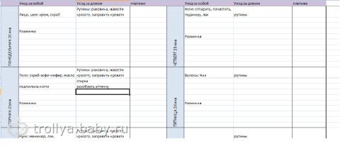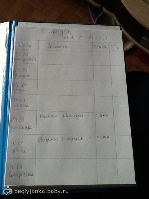 Так Анют, я с отчётами… всё читаю, что то переваривается, что то не усваивается… но я пытаюсь подстроить ведения бюджета под себя, чтобы у меня всё было по полочкам.По поводу задания к этому дню… стала составлять меню на неделю(что ранее для меня было невозможным почему то) Составила табличку, вписываю блюда, которые планирую готовить на неделе, заодно прикидываю с моим еженедельником, смогу ли я например по времени спечь или приготовить что то особенное и в следующей колонке пишу те продукты которых у меня нет в наличии… в конце недели составляю один закупочный список и в магазин с мужем затариваться на неделю… Сумму пока не пишу, так как хочу выяснить какая же сумма у нас уходит чисто на продукты, а для этого веду такой вот финансовый журнальчик, стараюсь заполнять каждый день или же собираю чеки в него и в удобное время расписываю затраты.