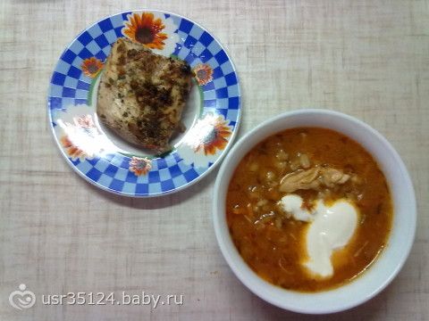 Обед: харчо с перловкой ( знаю, что по системе нельзя перловку, но кушаю ее периодически весь период своего похудения и поэтому даже за нарушение это не считаю) со сметаной и рыба, запеченная в рукаве.