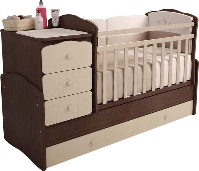 Пока ребенку 2-3 года, она будет представлять собой хитрую конструкцию, которая сочетает в себе саму кроватку, пеленальный столик, комод для вещей и много разных ящичков для всяческих нужд.
