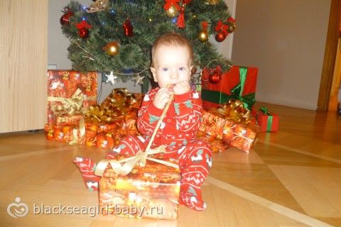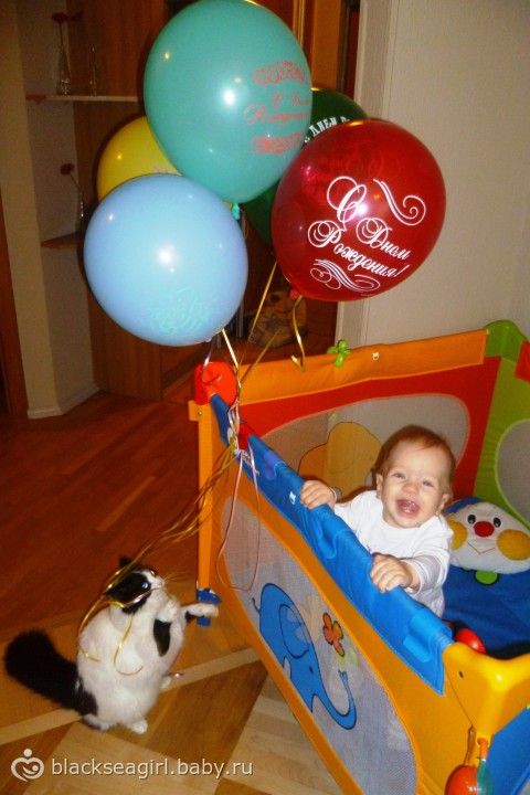 Мы говорим «ма», «ба», «да», встаем без поддержки и стоим секунды три. Ходим, держась за бортик манежа, кровати, стенку. А за день до «дня рождения» вдруг руку от стенки убрал и сделал два шага без поддержки. Ползает очень быстро. Играет, достает игрушки с полки в шкафу, сам открывает шкафы. Танцует и прыгает, держась за диван, поручни и т.д. Играем в «ку-ку», ладушки. Начинаем махать ручкой. Ест прекрасно, все время пытается забрать у меня ложку. Пьет из поильника, но больше любит из ложки. Любим целоваться. Еще любит, когда я его в живот целую — хохочет. Делает мне «пр-ррр» в живот или в шею — повторяет ))))