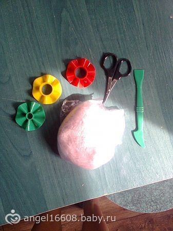 Хвостик куклы обмотать пищевой пленкой, затем узкой полоской мастики и к ней тоже приклеить цветочек.