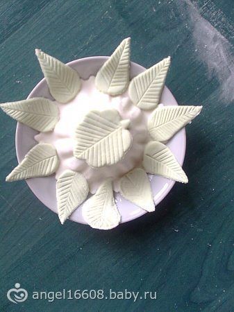 Вырезать листики и сделать ножом или зубочисткой прожилки. Из белой мастики на волнистой формочке для кекса высушить верхнюю юбочку.