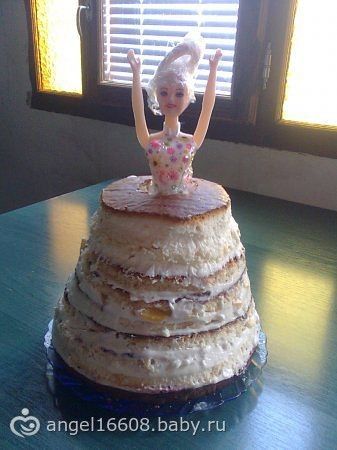 потом надо из коржей сделать юбку платья. Для этого каждый последующий корж делаем меньше предыдущего примерно на 1 см. А в центре вырезаем дырку для самой куклы. Я рюмкой измеряла.