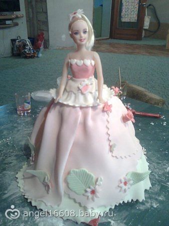 Куклу обернуть пищевой пленкой до плеч. До талии обернуть картоном и сверху пищевой пленкой. Это нужно для того, чтобы не повредить куклу ножом при разрезании торта.