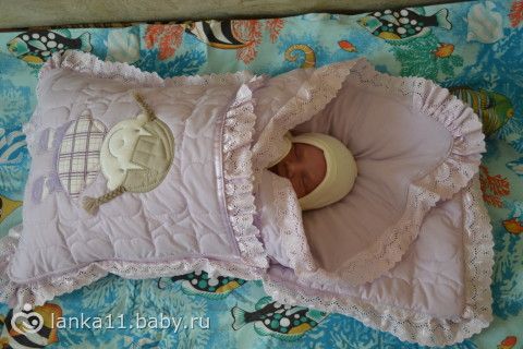 лето бывает разное, вот середина июля, неделю все выписывались просто в бодиках, а как раз в день нашей выписки дождь и ветрюга был… Хорошо запаслись конвертом) И кстати до сих пор им пользуемся, настолько он универсальный оказался)) на подушечке сейчас спит, одеялком застилаем кроватку и в коляске им накрывалась долго))