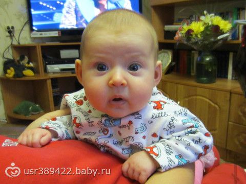 Любим играть с игрушками в шезлонге и на коврике. Хватаем игрушки. Да что игрушки, хватаем все — белье, вещи, маму — все тащим в рот. Активно гулит и по гулению можно очень четко определить настроение ребенка. Это забавно. Любимая фраза: «ав-ва» и «б-бу + пузырь из слюней». Любит играть в «ладушки» и «сороку-ворону», любит слушать резиновые пищалки и как кто говорит (хрюша — хрю, киса — мяу, собачка — ав...) Обожаем когда мама читает книжку с яркими картинками, прямо смеется иногда. Читаю Барто, Чуковского короткие четверостишия и потешки. Уже есть любимые
