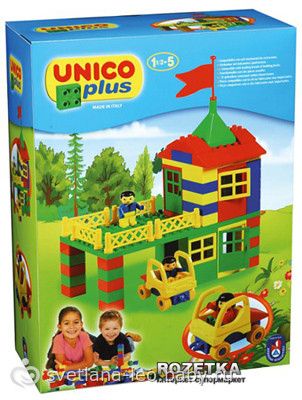 В общем стала искать детальки для Лего Дупло. И нашла совместимое с ним (полностью — мы уже детали перемешали все) — конструктор Unico plus — 100 деталек, машинка и 2 человечка. 850 р.