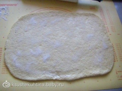 Раскатываем тесто. Смазываем сливочным маслом и посыпаем тремя столовыми ложками сахара.