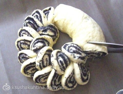 Сворачиваем тесто в рулет, отрезаем с обеих сторон кончики, из них мы сделаем центральную розочку на пироге. Соединяемся концы рулета в кольцо и начинаем разделывать. Ножницами через 1 сантиметр делаем надрезы, но до конца не дорезаем. Два листика оставляем снаружи, третий выворачиваем наверх к центру и так идем по кругу.Те кусочки, которые мы отрезали с концов рулета аккуратно выворачиваем, формируя розочку. Один кусочек кладем внутрь (его не будет видно), второй будет наверху. Вот так должно получиться.
