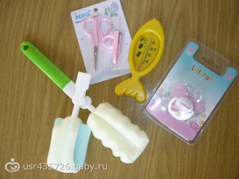 И такие приятные мелочи, которые тоже понадобятся с первых дней: Ёршики для бутылочек, соска, термометр для воды и маникюрный наборчик.