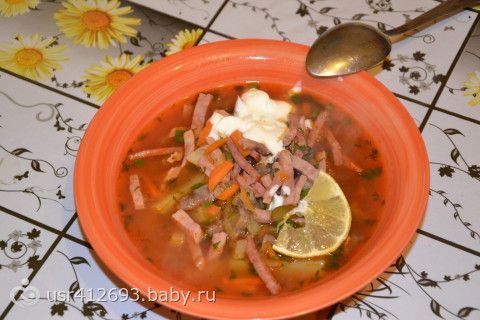 а я варю смешанный бульон из говяжьей кости и свиной, туда мяса, в конце варки бульона ложу копчёные рёбра с мясом, потом делаю зажарку как и ты, варю картошку и туда кидаю мясо, колбасу и зажарку, в конце специи и всё)) тоже со сметаной едим)))