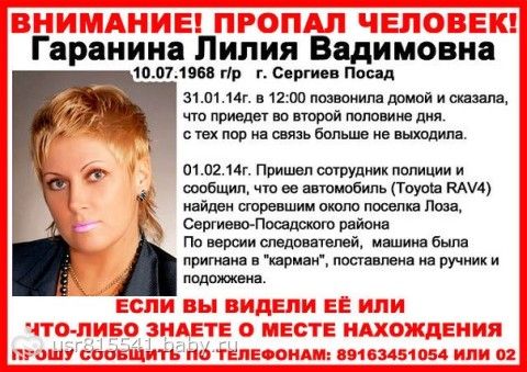сообщение дочери!!! доброго времени суток. В 12.00, 31.01.14г. мама позвонила нам домой и сказала, что приедет после обеда, попросив отварить курицу. Затем в 16.00 звонок от ее молодого человека с вопросом у нас ли мама, ибо она отключила два своих телефона. Я сказала, что ее нет у нас. Затем примерно в 16.30-17.00 звонок от ее подруги с тем же вопросом. Это меня довольно таки удивило и я начала звонить сама, но телефон выключен/вне зоне действия сети, второй же просто не брала. Я начала поднимать на ноги ее друзей, чтобы узнать, где и когда ее видели последний раз. Но безуспешно. Я до поздней ночи пыталась дозвониться до нее, но второй телефон тоже оказался выключенным.В 04.00 01.02.14г. звонок по домофону — полиция. Пришел сотрудник, с вопросом, дома ли моя мама, на ответ нет, ответил, что ее машина найдена сгоревшей около Лозы. Мы с бабушкой были шокированы этой новостью. Спустя 1.3 часа, подъехали еще двое сотрудников и записали все, что мы знаем. В 14.00 меня вызвали в полицию и попросили принести все документы мамы и ее фото. Там я дала показания, оставила все что есть, также смогла восстановить ее SIM карты. После, по версии следователей, узнала, что машина была пригнана в «карман», поставлена на ручник и подожжена. Нет ни одной зацепки, кто это сделал и где может находиться моя мама Прошу Вас, помогите найти ее. Пожалуйста. Отца нет с рождения. У бабушки онкология (рак). Надеюсь на Вашу помощь.